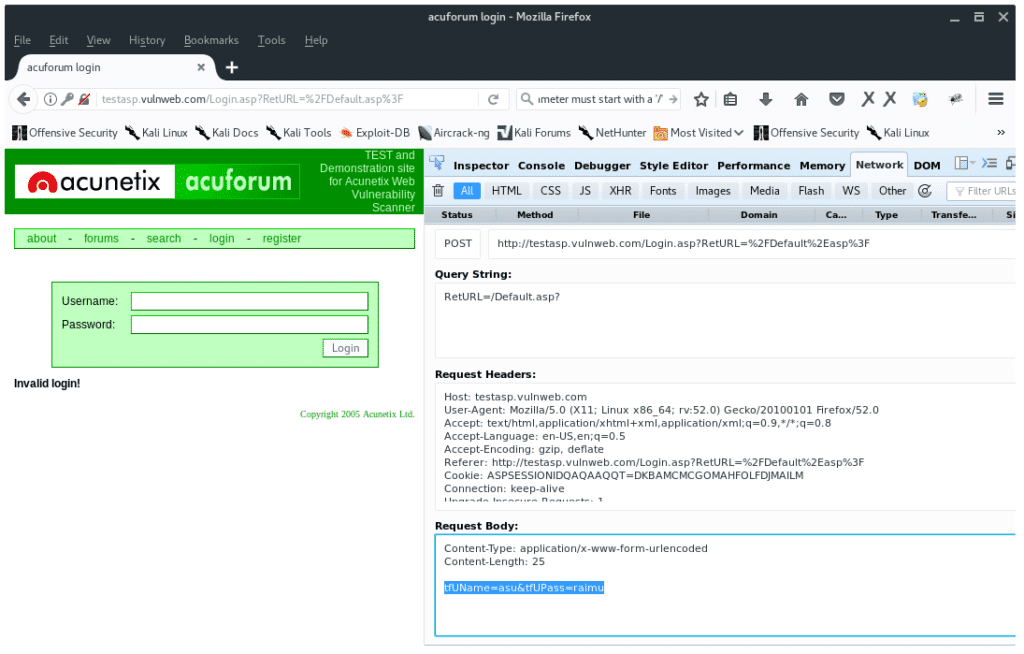 To obtain the post-form parameters, type whatever in the username and or password form. You will notice a new POST method on the network developer tab. Double click on that line, on the “Headers” tab click “Edit and Resend” button on right-side. On the Request Body copy the last line, such as “tfUName=asu&tfUPass=raimu”. the “tfUName” and “tfUPass” are parameters we need. As seen below: