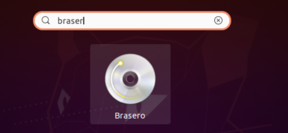 Now, type ‘Brasero’ in the search bar to search the Brasero application. The Brasero application icon should appear in the search results. Click the icon to open this application.