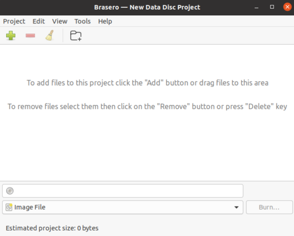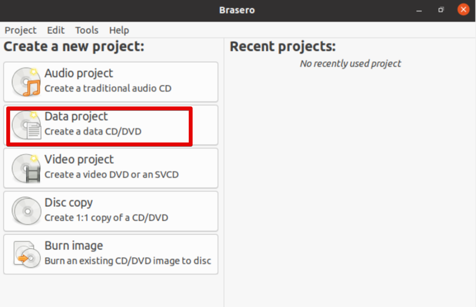 The following Brasero application window will display on your system. Select the ‘Data project’ option from the menu on the left side of the window.