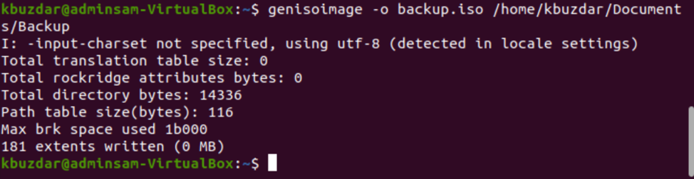 Here, we are creating an ISO file with the name ‘backup.iso’ from the backup directory /home/kbuzdar/Documents/Backup. Use the following command to do so: