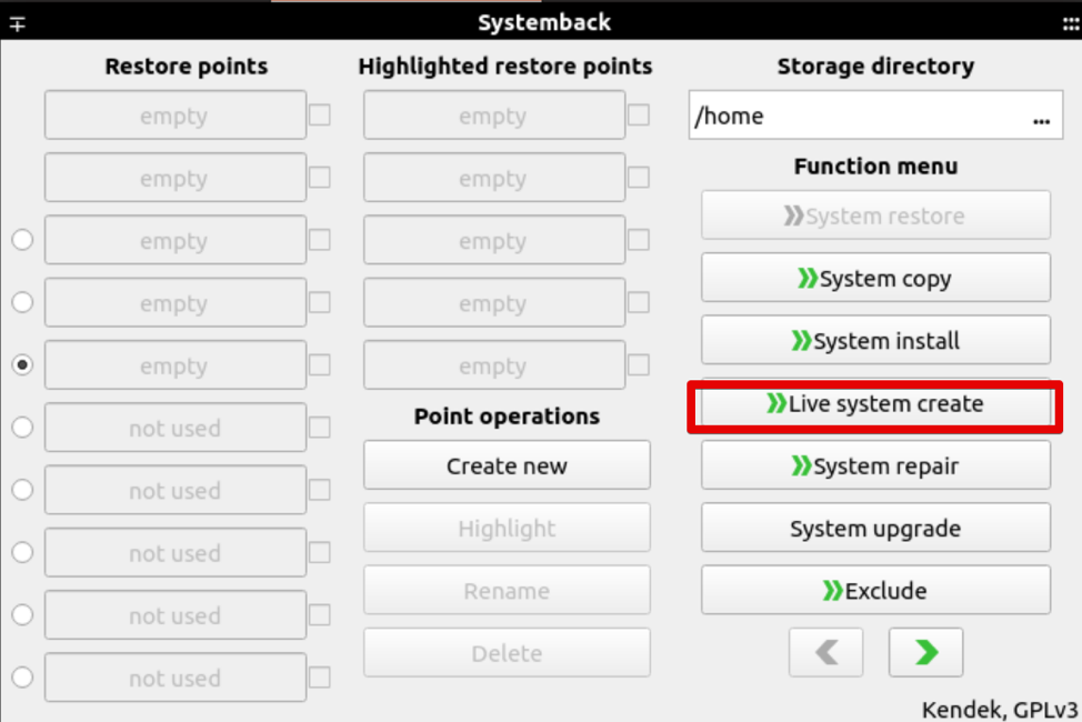 After that, the following window will display on your system. You can create the system’s restore points, create a copy of the system to another partition, create a live system, and more. Click the ‘Live system create’ option to create a new live system.