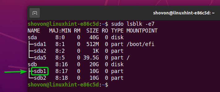 I have a 20 GB hard disk sdb on my Ubuntu machine. I have created 2 partitions sdb1 and sdb2 on this hard disk. I will use the partition sdb1 in this article.