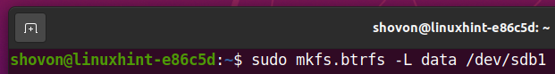 To create a Btrfs filesystem with the label data on the sdb1 partition, run the following command: