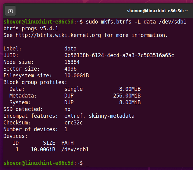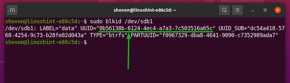 As you can see, the UUID of the Btrfs filesystem is 0b56138b-6124-4ec4-a7a3-7c503516a65c.