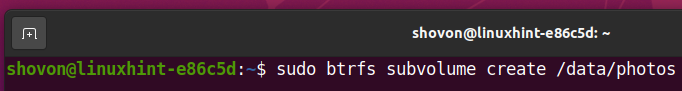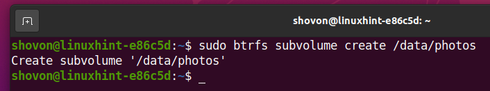 For example, to create a Btrfs subvolume in the path /data/photos (the Btrfs filesystem is mounted in the /data directory), run the following command: