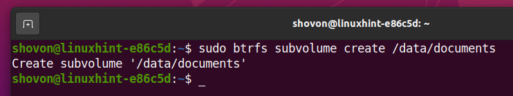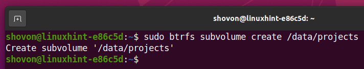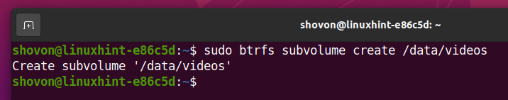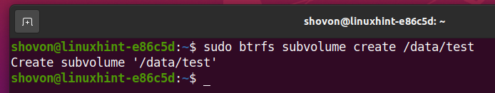 Let’s create a Btrfs subvolume test on the Btrfs filesystem mounted on the /data directory as follows: