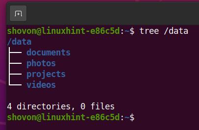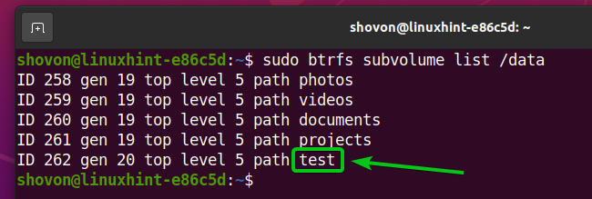 As you can see, the test subvolume is created on the Btrfs filesystem mounted on the /data directory.