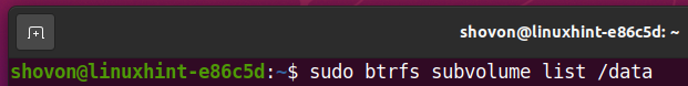 You can find the name or the ID of all the Btrfs subvolumes created on the Btrfs filesystem mounted on the /data directory as follows: