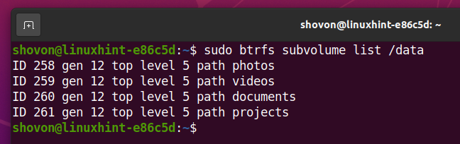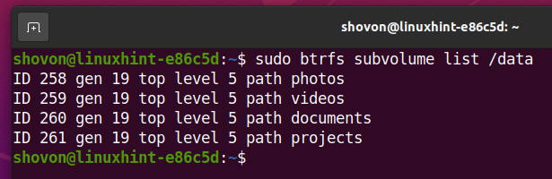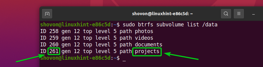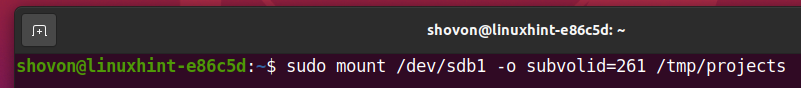Let’s mount the projects Btrfs subvolume. The projects Btrfs subvolume has the ID 261.