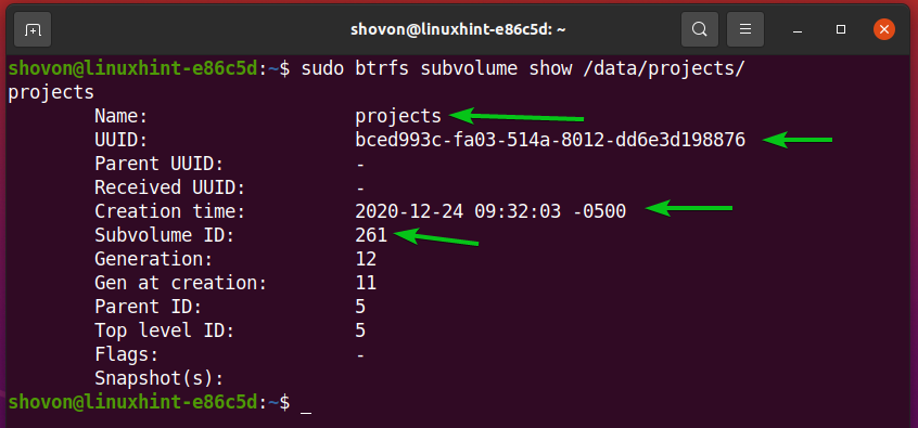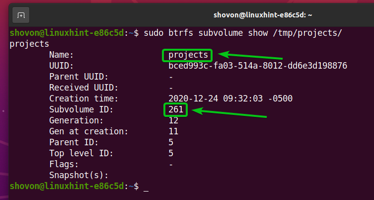 You can find a lot of information about a Btrfs subvolume (let’s say /data/projects) like the subvolume name, the subvolume UUID, the subvolume ID etc. as follows: