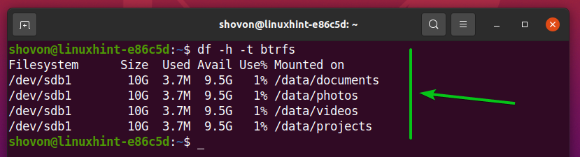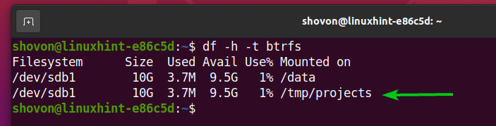 You can also see that the Btrfs filesystem (the projects subvolume) is mounted on the /tmp/projects directory.