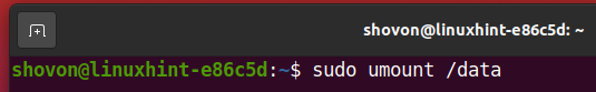 First, unmount the Btrfs filesystem, which is mounted on the /data directory as follows: