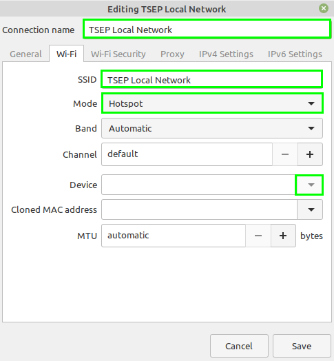 4. Next, we need to configure the WiFi Hotspot. Enter the Connection Name in the ‘Connection Name’ and ‘SSID’ fields you wish to set. Moreover, in the mode section, select ‘WiFi’. You will see the option that displays your network card’s physical address in the’ Device’ menu. Choose the wireless network card, and the initial configuration is performed.