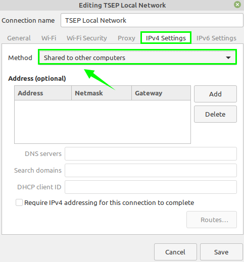 6. Further, click on ‘IPV4 Settings’ and ensure that the method is set to ‘Shared to other computers.’