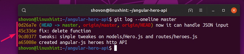 As you can see, all the commits of the master branch are displayed. Notice that each of the commits has a unique hash. To create a new branch from an existing commit, you have to use the hash of your desired commit.