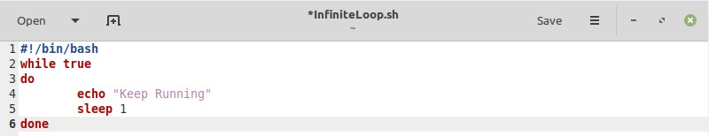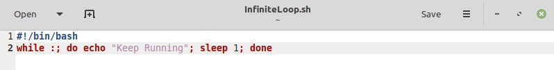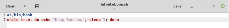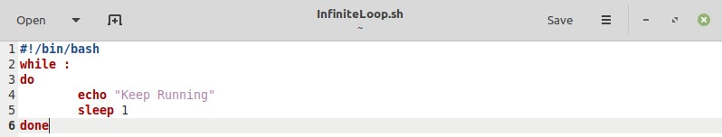 In this example, we will be creating a never-ending “while” loop by pairing it up with the “:” command in Bash in Linux Mint 20. Just copy the following script shown in the image in a Bash file.