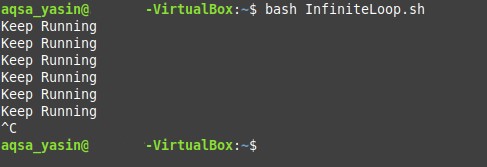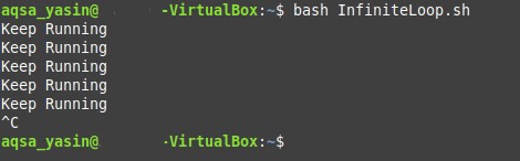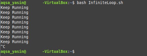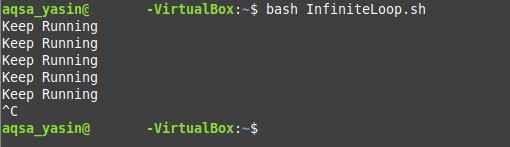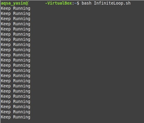 When the said script is executed, you will notice unending messages saying, “Keep Running”, being displayed on your terminal, as shown in the following image. These messages will only stop if you press Ctrl+ C. Otherwise, this loop will just go on and on.