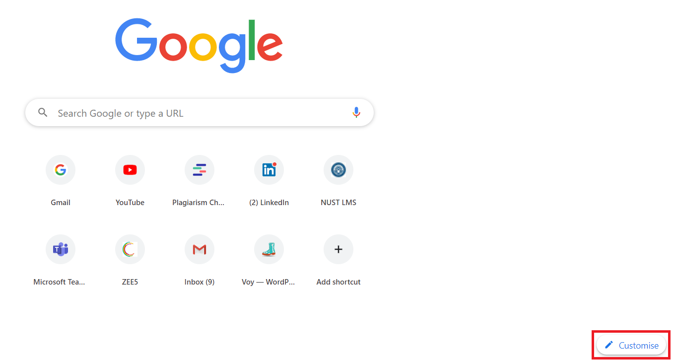 Double click on the shortcut icon of Google Chrome present on your desktop to launch a new Google Chrome window or if you already have Google Chrome window opened, you can click on the “+” icon to launch a new tab whose background you want to customize since this method will only add a specific Page Background to a particular tab. Now click on the Customize button located at the bottom right corner of your newly opened Google Chrome tab as highlighted in the image shown below: