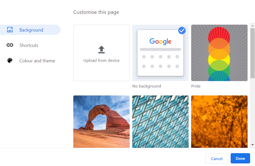 As soon as you will click on this button, the “Customise this page” window will appear on your screen as shown in the following image. In this window, you can notice that currently, no background is selected for Google Chrome.