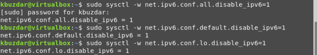 $ sudo sysctl -w net.ipv6.conf.default.disable_ipv6=1