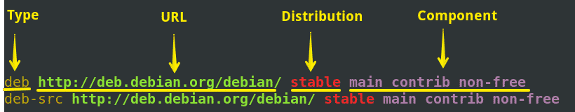 The final term in the above format represents the categories of the Debian package. The available categories of the Debian distribution are main, contrib, and non-free.