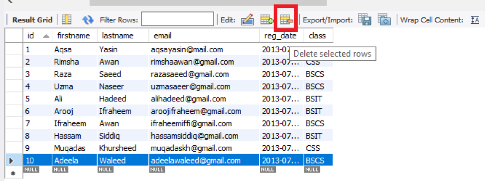 A very simple method to delete row/rows from the MySQL table is via the workbench grid view as we have a table ‘student’ with ten records in it. To delete a single row from a table, you have to select the particular row and press the delete-row icon from the grid window as we have selected the 10th row and pressed the highlighted icon below.