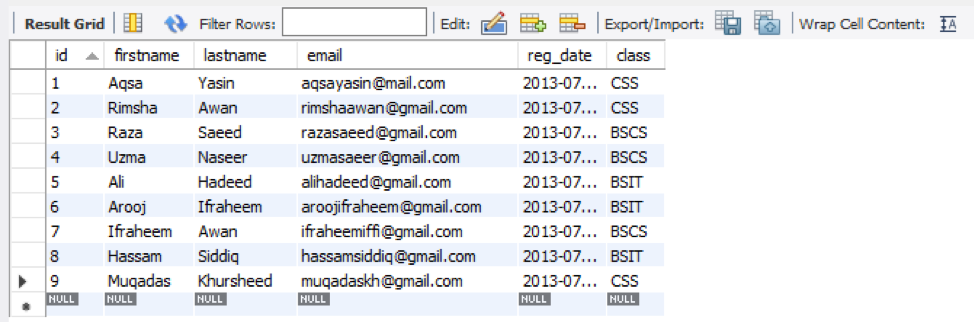 First of all, you must have some data in your database schema to perform queries on it. Let’s make a table named ‘student’ in the database ‘data’ using a CREATE query in MYSQL Workbench or Command-Line Client. The table ‘student’ has six columns: ‘id’, ‘firstname’, ’lastname’, ‘email’, ‘reg_date’, and ‘class’. We will be adding values to its columns using its grid view as below and click on the ‘Apply’ button to save changes. Now you can perform any update on these records.