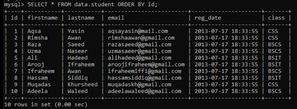 On display all the rows of table ‘student’, we can see that the record of the 10th row has been deleted from the table.