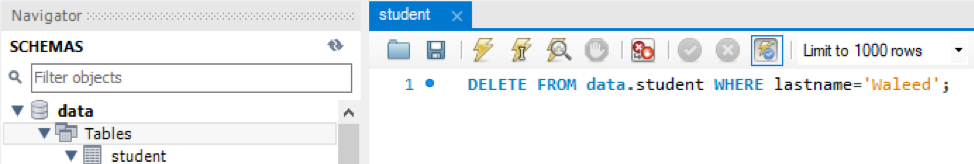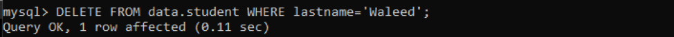 Let’s delete a single row using the ‘WHERE’ clause in the ‘DELETE’ query. We are deleting the row where the ‘lastname = Waleed’, which is row number 10 as above. Let’s try it as:
