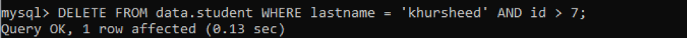 You can also delete the single row from the table, using more than one condition in the ‘DELETE’ query of MySQL. We are using two conditions in the ‘WHERE’ clause, e.g., ‘lastname = khursheed’ and ‘id > 7’. This query will only delete the row which has an id greater than ‘7’, and its lastname is ‘khursheed’. In our case, it is the 9th row.