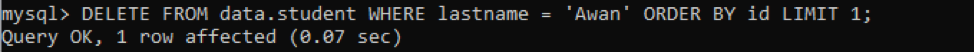We can also delete a single row via the ‘LIMIT’ clause in the ‘DELETE’ query. In this query, we have to define a limit as ‘1’ for a single row to be deleted. We have defined a limit value as ‘1’ in the ‘WHERE’ clause of the ‘DELETE’ query. It will only delete the first row from all the records having ‘lastname = Awan’, which is row number 2.