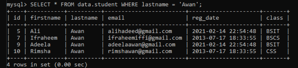 Let us update the table ‘student’ first by adding some records to it so we can delete multiple rows. Let’s display the records of a table where the lastname is ‘Awan’, using the ‘SELECT’ query with the only WHERE clause. This query will display only 4 rows, as we have only 4 records for the column ‘lastname = Awan’.