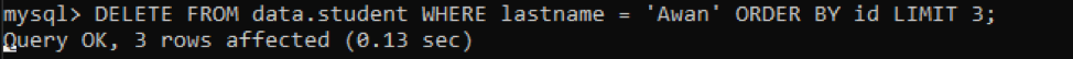 To delete multiple rows from a table, we can be using the ‘LIMIT’ condition in the ‘WHERE’ clause of the ‘DELETE’ query. We just have to define the ’LIMIT’ other than 1 or any negative number. So, we have been defining ‘LIMIT’ as ‘3’, to delete 3 rows from the table. It will delete the first three rows of the record having the ‘lastname’ as ‘Awan’.