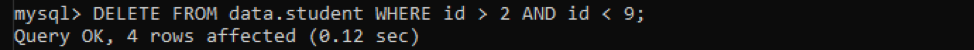We are using the same above the table and defined two conditions in the ‘WHERE’ clause to delete rows having ‘id’ greater than 2 and less than 9 as follows: