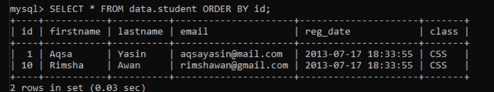 Display the remaining records of the table using the ‘SELECT’ query. You will see, there is only 1 record left for ‘lastname’ having the value ‘Awan’, and three rows have been deleted.