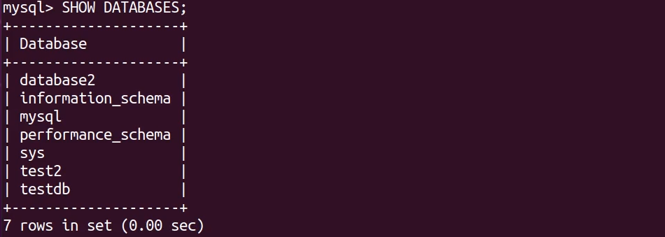 After deleting the database, we will list the databases again using the ‘SHOW DATABASES’ command.