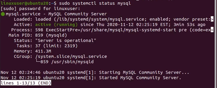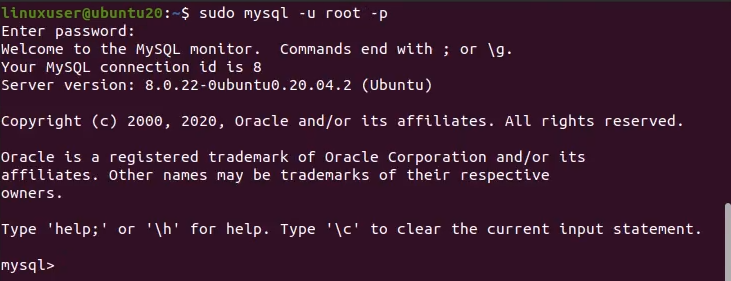 After starting the service, connect to the MySQL client or log in to the MySQL shell as a root user. If you do not have access to the root user login, replace ‘root’ with your username. In this article, we will use the terminal to demonstrate the process instead of the GUI, known as the MySQL WorkBench.