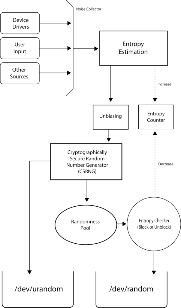The main differences between /dev/random, /dev/urandom and /dev/arandom is that /dev/random blocks if the entropy is not indicating sufficient randomness, /dev/urandom does not block ever, even when the pseudo random number generator is not fully seeded when booted and lastly /dev/arandom blocks only when pseudo random number generator is not yet fully seeded. In short, /dev/random is the safest of all, then comes /dev/arandom and the least safest is /dev/urandom. Normally /dev/random and /dev/urandom are used because /dev/arandom in many terms is similar to /dev/urandom. The entropy estimation for the random number pool in short is used to determine the randomness of numbers generated. The more entropy is, the more randomness is achieved and better it is. The current amount of entropy and size of its entropy pool are available at /proc/sys/kernel/random/ named as entropy_avail and pool_size, respectively, which can be displayed in terminal by using commands: