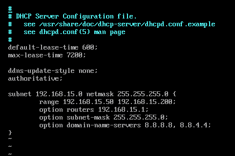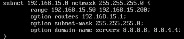 The subnet section defines the DHCP configuration for the network subnet 192.168.15.0/24.