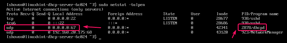 Once you start the dhcpd service, the DHCP server should be running on UDP port 67 as you can see in the screenshot below.