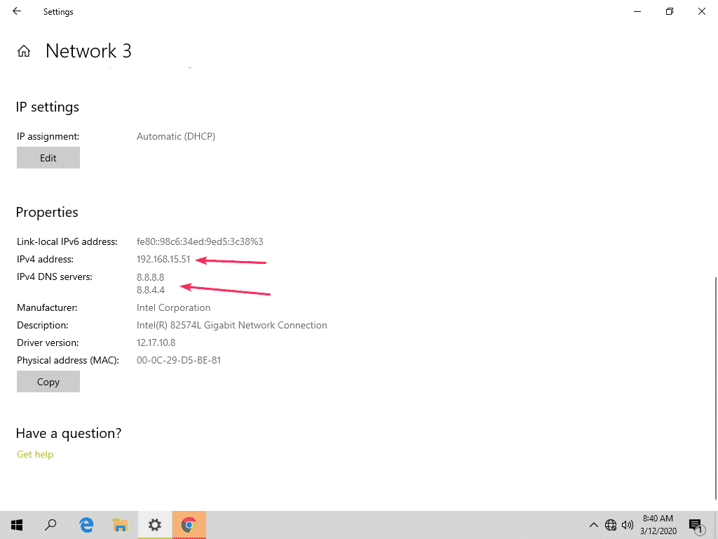 The Windows 10 computer also got an IP address 192.168.15.51 from the DHCP server.