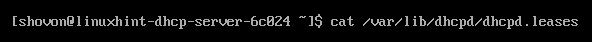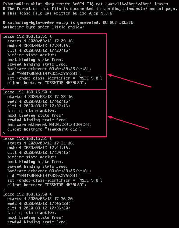 As you can see, a lot of information about the hosts which assigned IP addresses via the DHCP server is stored in the file /var/lib/dhcpd/dhcpd.leases.