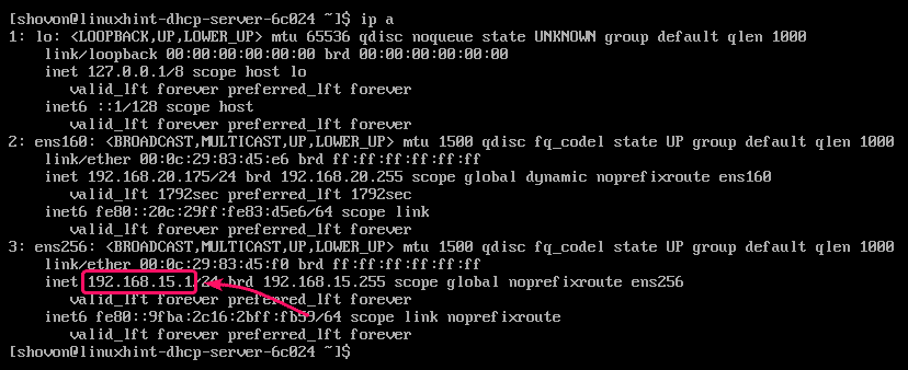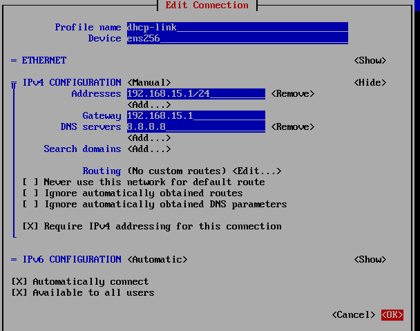 At this point, the static IP 192.168.15.1 is set on the CentOS 8 machine.