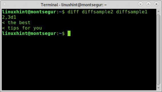 As you can see, since we used the file diffsample1 as reference, in order to make the file diffsample2 exactly equal we need to delete (d) lines two and three (2,3) like in the first file and first lines (1) will be equal.
