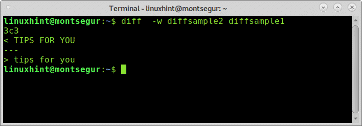 As you can see differences were found, additionally to the capital letters. Now lets apply the option -w to instruct diff to ignore blank spaces: