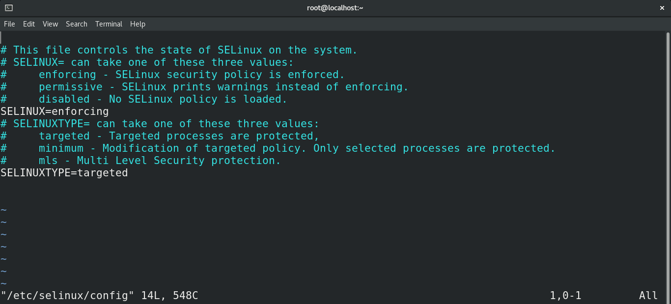 Another way is to manually edit the SELinux configuration file. Open the file in your favorite text editor. I’ll be opening it in Vim.