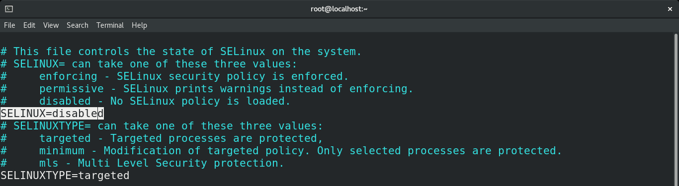 Here, the “SELINUX” variable determines the state of SELinux. As you can see, there are three possible Scroll down to the “SELINUX” variable and change its value to “disabled”.