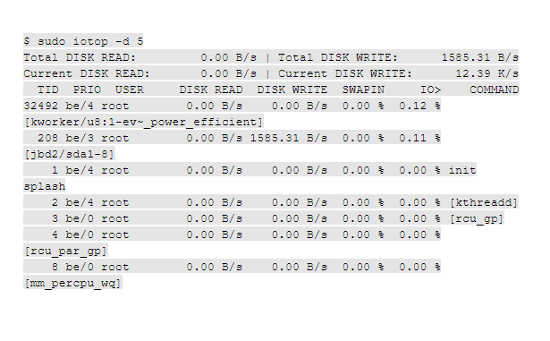 The iotop command is the top-utility while looking at the disk I/O by gathering all the usage information through the Linux kernel and get you an idea of the most demanding terms in your disk I/O. Look at the given example to check out when the loop time has been set to 5 seconds. The display will get updated by itself and overwrites the output.