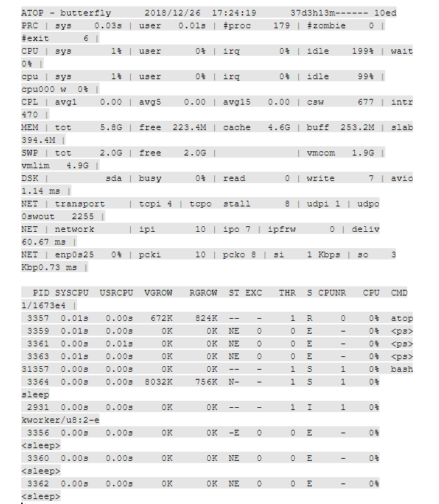 The atop command is similar to the top that provides a lot of information on system performance by including some of the stats on your disk activity.
