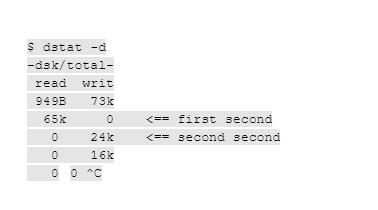 This command offers stats on a lot more than just disk activity. Thus, if you wish to view your disk activity, it is recommended to make use of the -d option. You will get a continuous list of disk read/write measurements as shown down until you stop it getting displayed with a ^c. Also, it should be noted here that after every subsequent row, you will need to report the disk activity within the following time interval where the default is just set to one second.